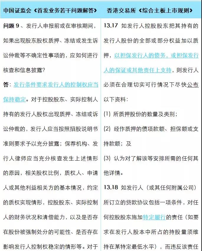 3. 中国证监会要求保荐机构、发行人律师对控股股东的财务状况和清偿能力进行核查和评估,并作出是否影响发行人控制权稳定性的“结论性”判断;而联交所仅要求对控股股东为发行人的贷款所作出的股权质押进行“描述性”公布,并未要求对控股股东的财务状况和清偿能力进行核查和评估。